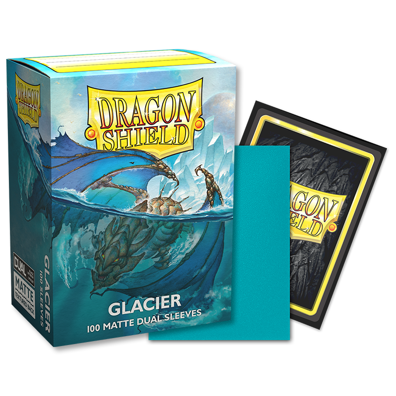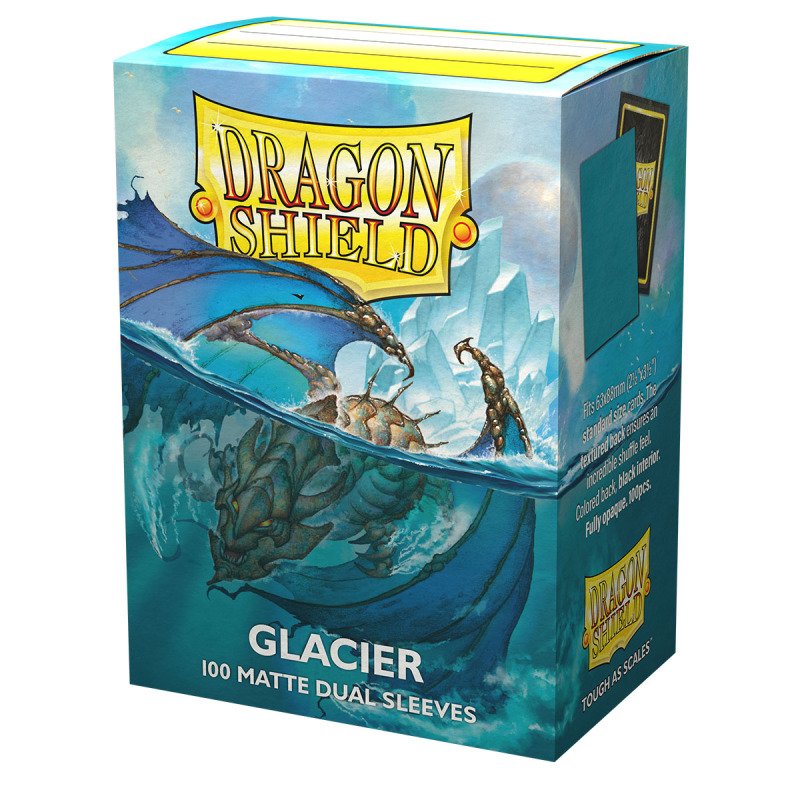 Glacier, immense and frosty. Dragon Shield Matte Dual sleeves. Clear front and a textured matte back. Fully opaque sleeves with a black interior, an elegant backdrop for black bordered cards. The sturdy cardboard box fits 75+ single sleeved cards or 65+ double sleeved cards. Every box has a label on the top for personalization.
